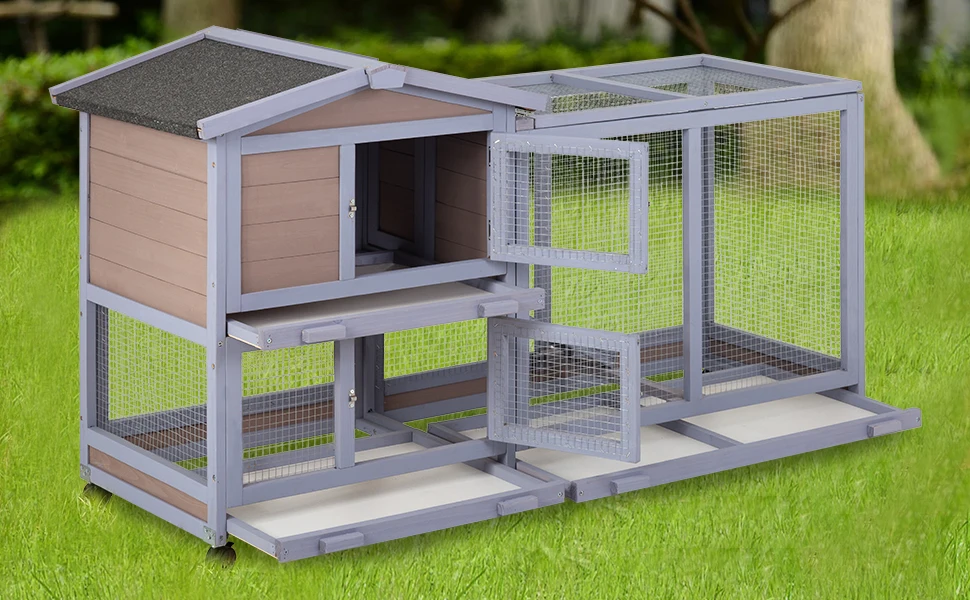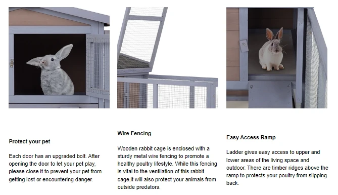 A large inside area and extra run cage give the animals more space to move around. Besides, Purchasing an extra run cage to extend our standard rabbit hutch which gives your poultry more activity space.